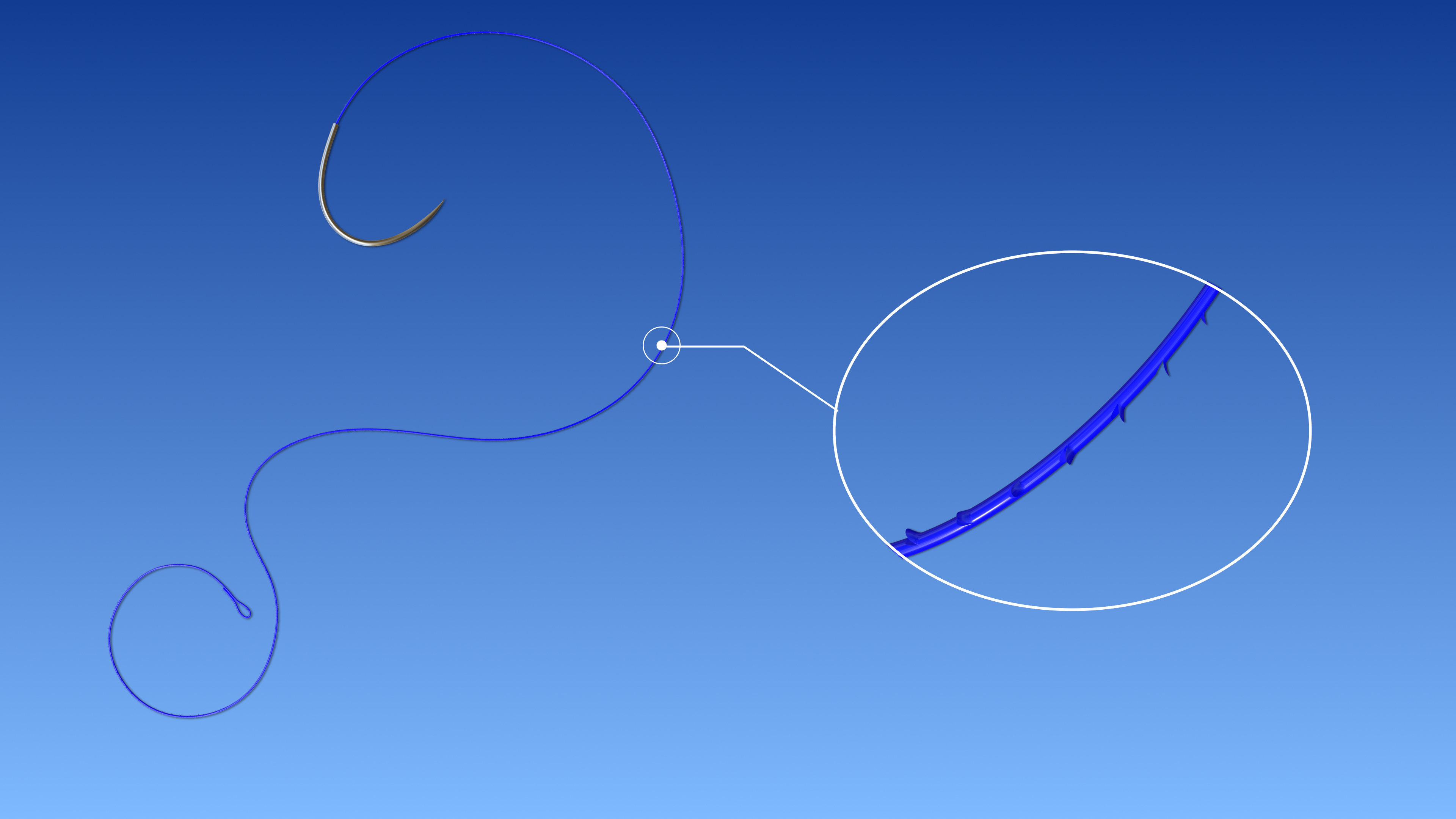 是一种由蓝色的聚丙烯单丝制成的单股的不可吸收无菌外科缝线,缝线表面有三维的微小均匀分布的倒钩,链接不锈钢缝针。该产品以无菌状态提供,经环氧乙烷灭菌,一次性使用。